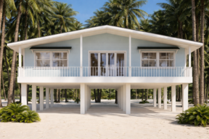 Constructed with a robust combination of concrete and steel, the Sunrise Model stands as a testament to innovative engineering. Its elevated design on sturdy stilts ensures that your home remains secure, even in the face of surging tides and tempestuous winds.